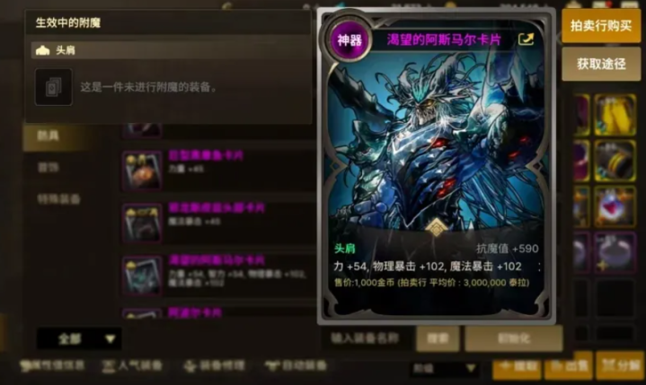 不得不说虽然这些天价粉卡的价格确实是非常高,但其属性也是非常强大的。尤其是隔壁服的这张头肩卡,直接增加了102点的暴击和54点的力量智力,这属性比无之奥兹玛卡片还要强很多啊。而且这张卡片还增加了足足590点抗魔值了,难怪即使穿的是同一套史诗套,但土豪和平民玩家之间的抗魔值差距会这么大,光是这一张附魔卡片就有好几百点的抗魔值差距了吧。